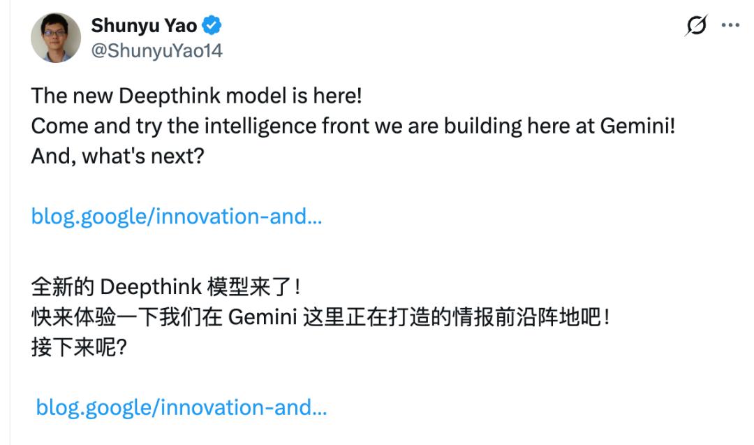去年刚从Anthropic跳槽到谷歌DeepMind的清华校友姚顺宇,也参与了Deep think新模型的开发。