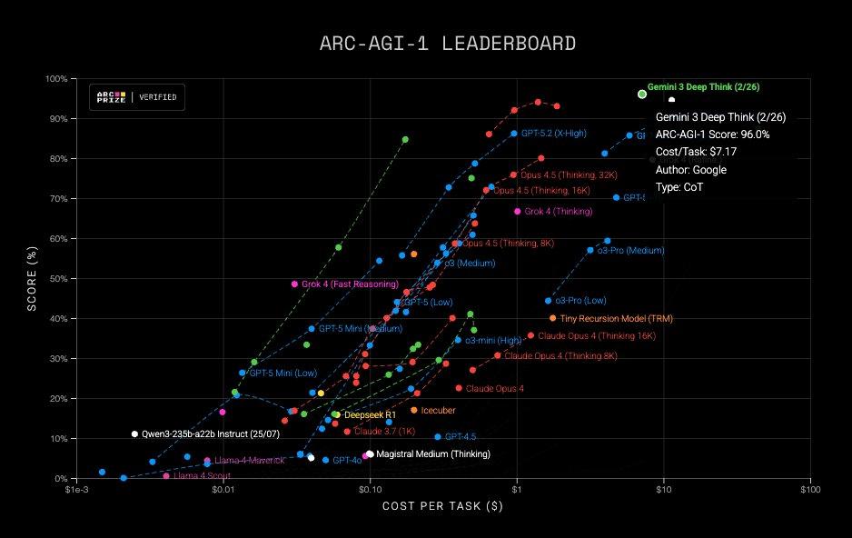 而在ARC-AGI-1上,Gemini 3 Deep Think取得了96%的成绩,直接顶到天花板了。