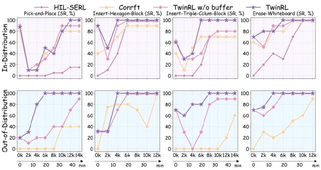 定量与定性分析. 我们在 4 个真实世界操作任务上系统评估 TwinRL,包括 Pick-and-Place、Insert-Hexagon-Block、Insert-Triple-Column-Block 以及 Erase-Whiteboard。