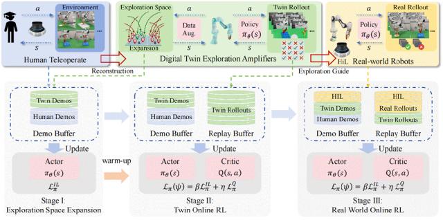 整个框架由三个紧密耦合的阶段构成:探索空间扩展、数字孪生并行在线强化学习以及 sim-to-real 引导的真实世界探索。