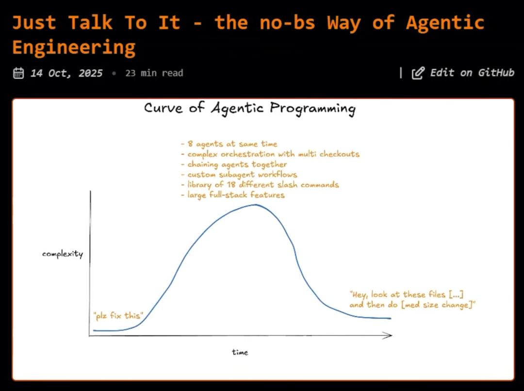 Fridman: 你有篇文章里提到一个图,我特别喜欢。横轴是时间、纵轴是复杂度。最左边是“请帮我修一下”,一个短 prompt 就解决;中间突然变成地狱模式:八个 agent、复杂编排、多个 checkout、串联子 agent、自定义工作流、十八个 slash command、全栈大功能……你变成了极度组织化、极度复杂的“高级工程师”;但再往右,到了所谓“宗师境界”,又回到了短 prompt,就说“看看这些文件,把这些改了”。你是怎么从中间那段复杂度里走出来的?