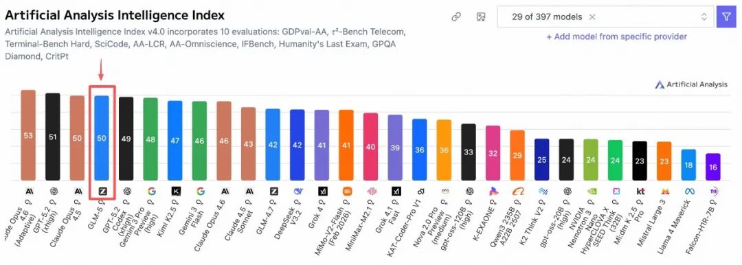 然后就是GLM-5的突然发布,空降Artificial Analysis开源模型的榜一,仅次于Claude Opus 4.6和GPT-5.2(xhigh)。