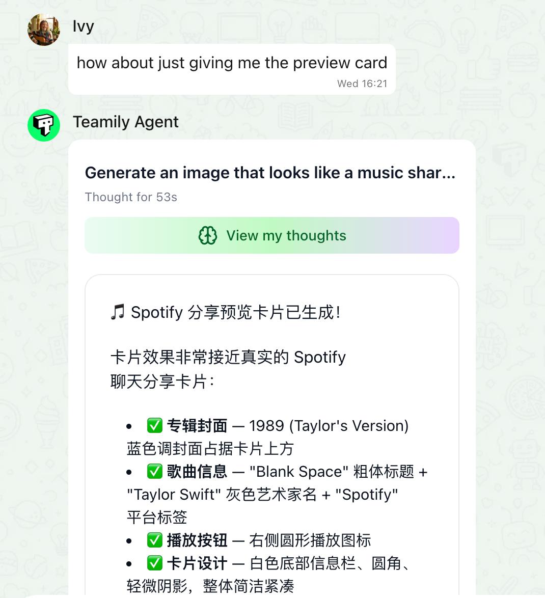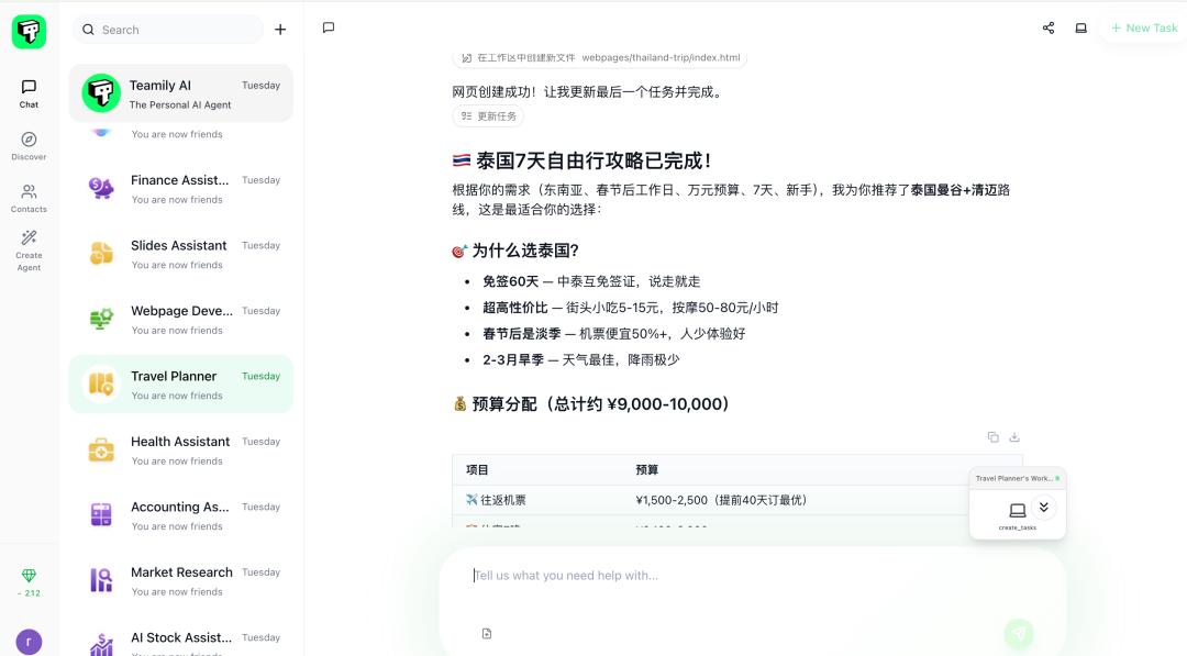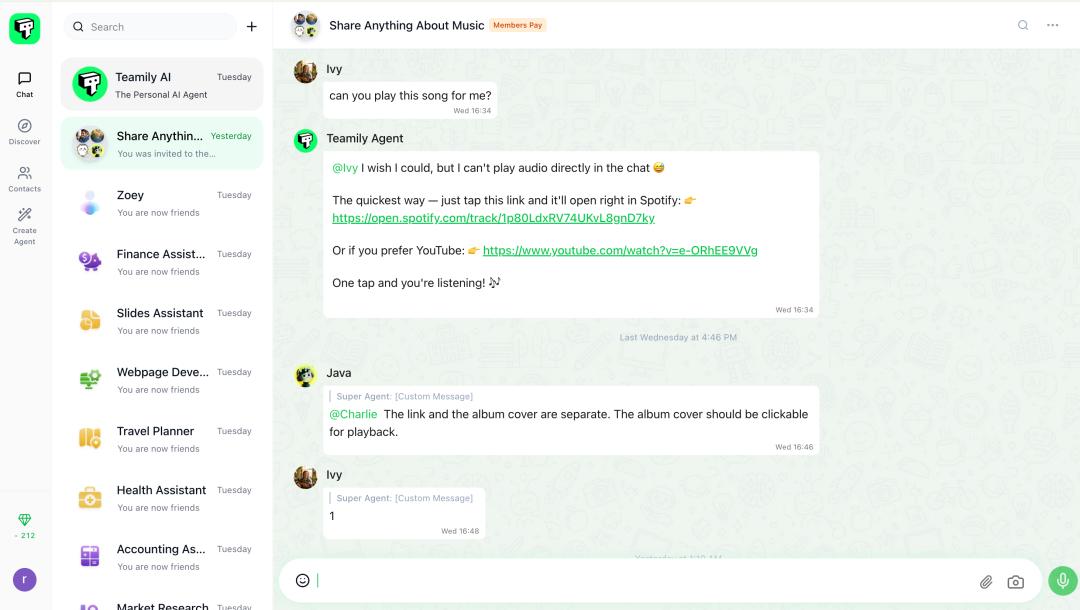以 Teamily AI 为例,基础社交功能之外,Teamily AI 不仅能直接读懂多模态对话并让 agent 直接完成任务,产生跨群组记忆、自动搜寻所有历史会话共享填补信息差,还能自然语言创建 agent,并让其并行多任务产生群体智能。