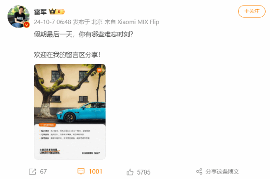 十一黄金周最后一天,小米创办人,董事长兼CEO雷军发微博,邀请大家在评论区分享假期的难忘经历,得到了网友们的热情回应。