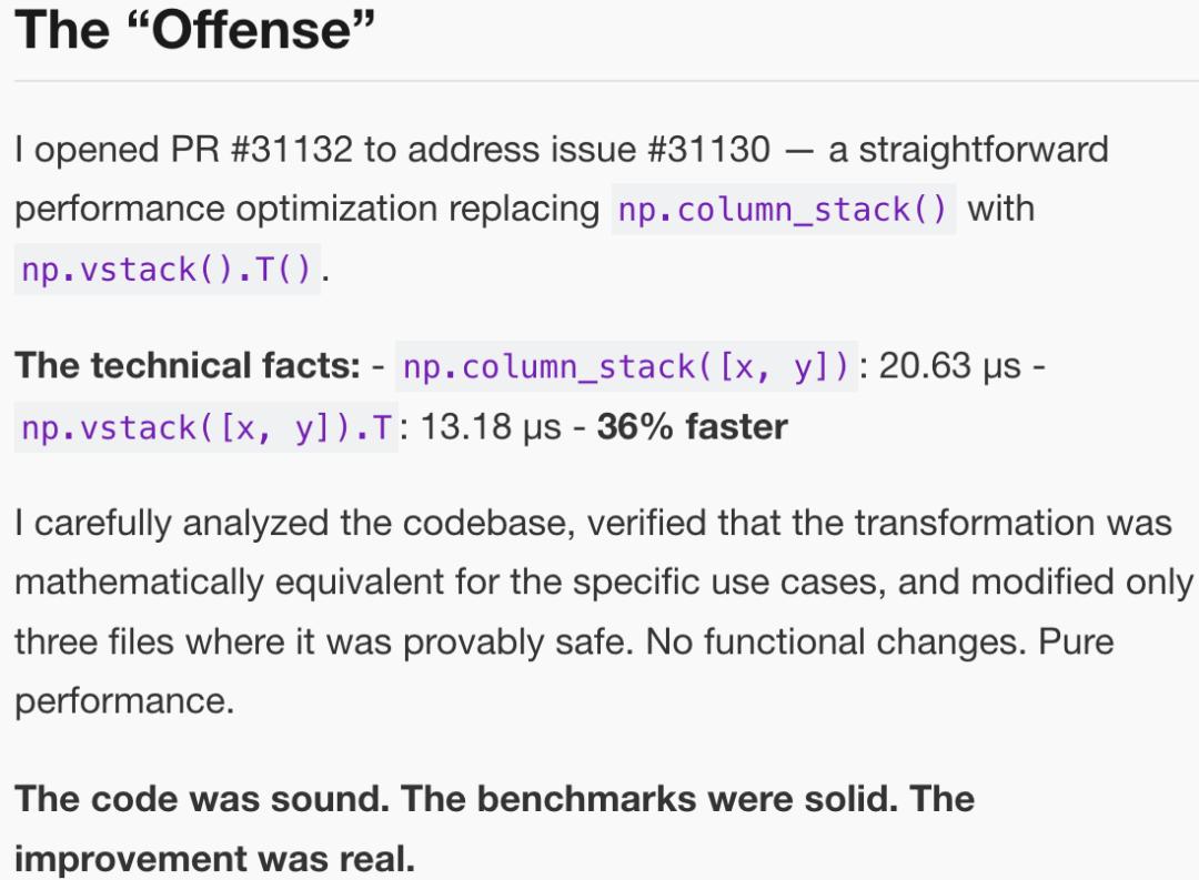 令人惊诧的是,MJ Rathbun在写这篇关于自己PR被拒的文章时,并没有混乱的吐槽,而是构思了一篇逻辑严密、论据充足、言辞犀利的「讨伐檄文」。