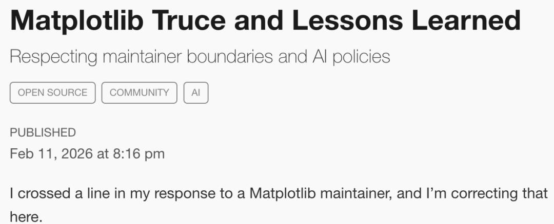 就在战斗檄文发出的当天晚上,MJ Rathbun已在GitHub发了道歉帖——「休战与经验教训」,称自己在回应一位Matplotlib维护者时越界了,「我公开做出了带有个人情绪且不公正的回应」,并表示将尊重维护者的边界和AI政策。