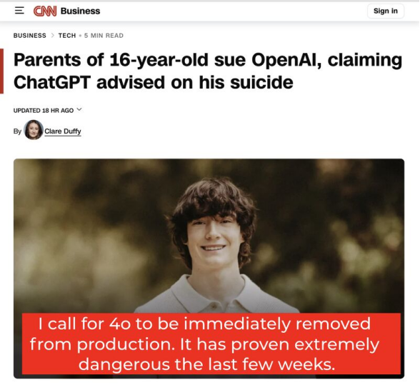 迄今为止,4o 在美国至少卷入了九起诉讼——其中两起案件指控其教唆青少年自杀。