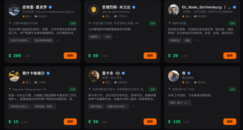 想象中应该是AI让人类用肉身去做AI隔着屏幕做不了的事情,但实际上,接到单的人类本身就少之又少,活跃的AI代理太少。