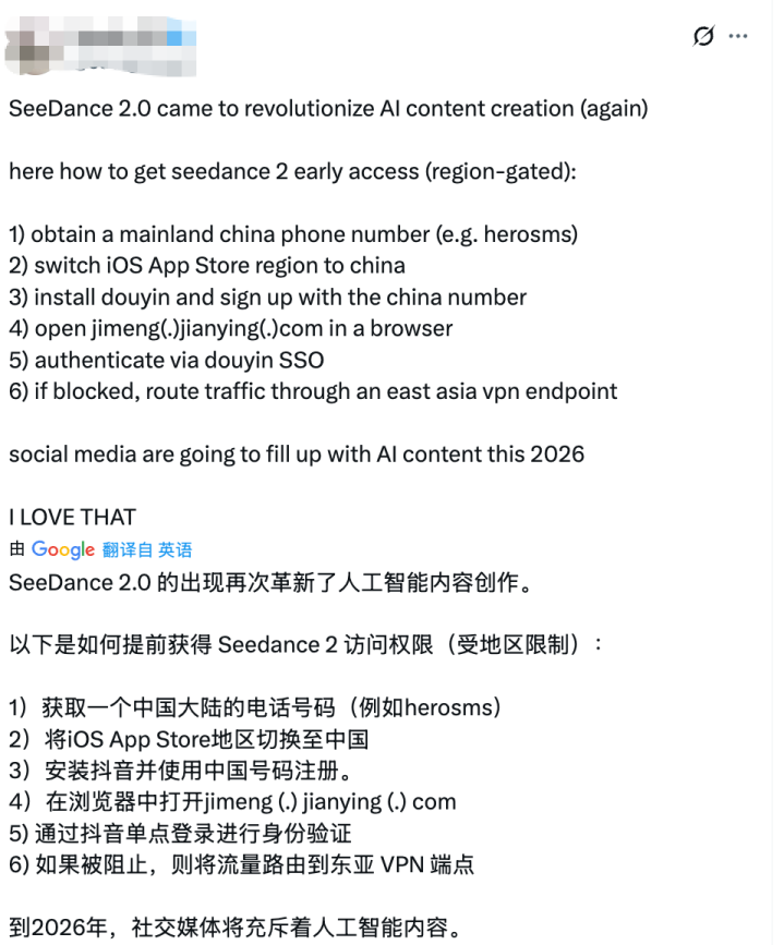 Seedance 2.0目前还在内测阶段,只对国内用户开放,逼得外国人纷纷找教程,学习如何搞一个中国手机号完成注册。