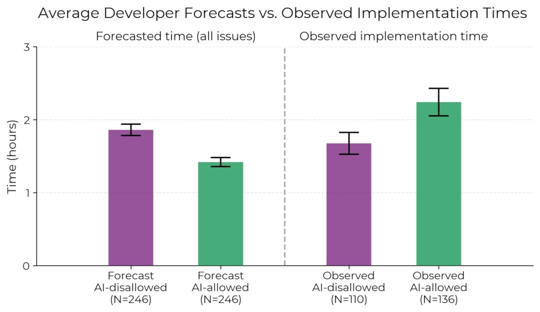 更打脸的是,非营利机构 METR 的一项研究发现,给软件开发者用上 AI 之后,任务完成时间反而延长了 20%。