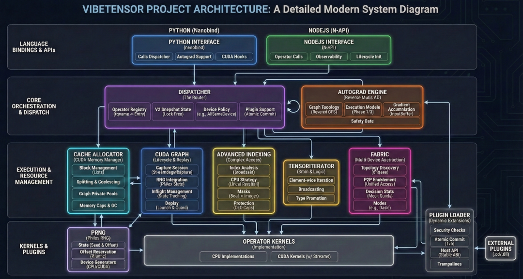 VibeTensor是一个受PyTorch启发的即时运行时,它具有全新的C++20内核(CPU + CUDA)、torch风格的Python覆盖层以及实验性的Node.js/TypeScript API。