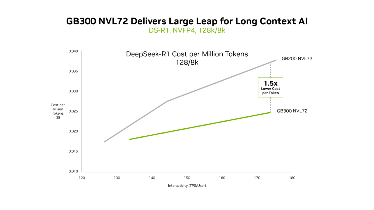 AI 推理成本方面,相比 Hopper 架构,新平台将每百万 Token 的成本削减至 35 分之一;即便与上一代 Blackwell(GB200)相比,GB300 在长上下文任务中的 Token 成本也降低至 1.5 分之一,注意力机制处理速度翻倍,适配代码库维护等高负载场景。