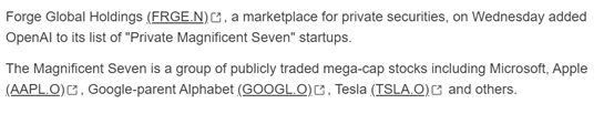 目前,私人证券交易市场Forge Global Holdings已经将OpenAI加入到其“私人卓越七巨头”头名单中。卓越七巨头是一组包括微软、苹果、谷歌母公司Alphabet、特斯拉等市值巨大的公开交易股票。