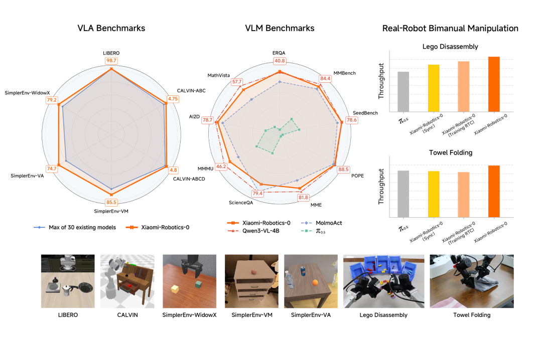 小米刚刚开源的Xiaomi-Robotics-0,使用双脑协同架构及两阶段训练策略,用47亿参数在消费级显卡上跑出了惊人的精细度,叠毛巾、拆乐高这种单任务可保持30分钟的连续作业高稳定性,可以说几乎做到了实用级。
