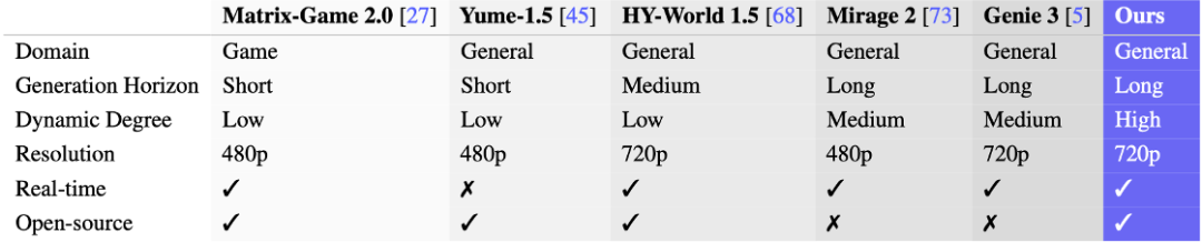 LingBot-World 在适用场景、生成时长、动态程度、分辨率等方面的表现