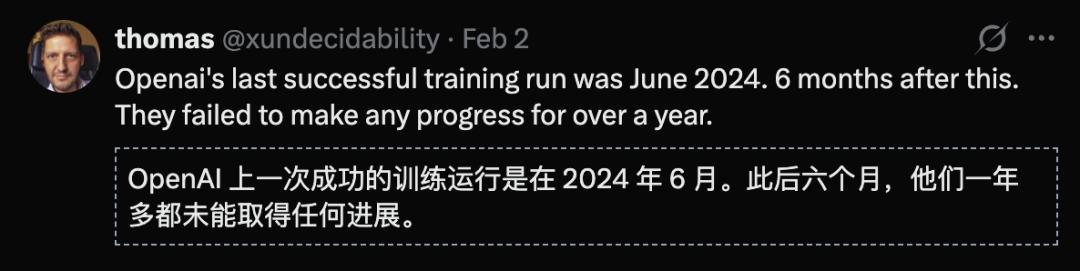 有网友暗指OpenAI在模型开发上「停滞不前」。自从2024年6月后,OpenAI在大型模型预训练上遇阻之后,一年多以来无重大突破。
