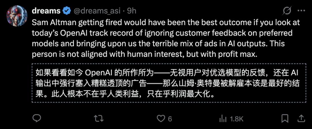 网友批评了奥特曼「与人类利益不一致,只追求利润最大化」,在AI输出中插入广告的做法,甚至表示奥特曼在2023年被短暂解雇本应该是「最佳结局」。