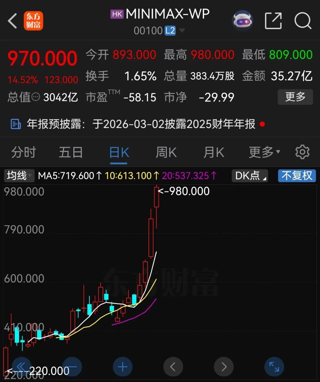2 月 20 日,港股马年首个交易日,MiniMax 收盘股价报涨 14.52%,市值一度冲破 3042 亿港元。