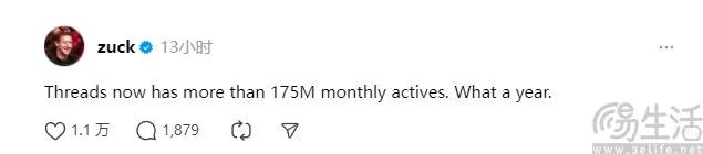 但无论如何,Threads的成功对于当下的Meta来说有着非常积极的作用,因为它证明了Meta的应用家族依旧还保持着活力,Meta也还有能力打造出一款上亿人使用的App。