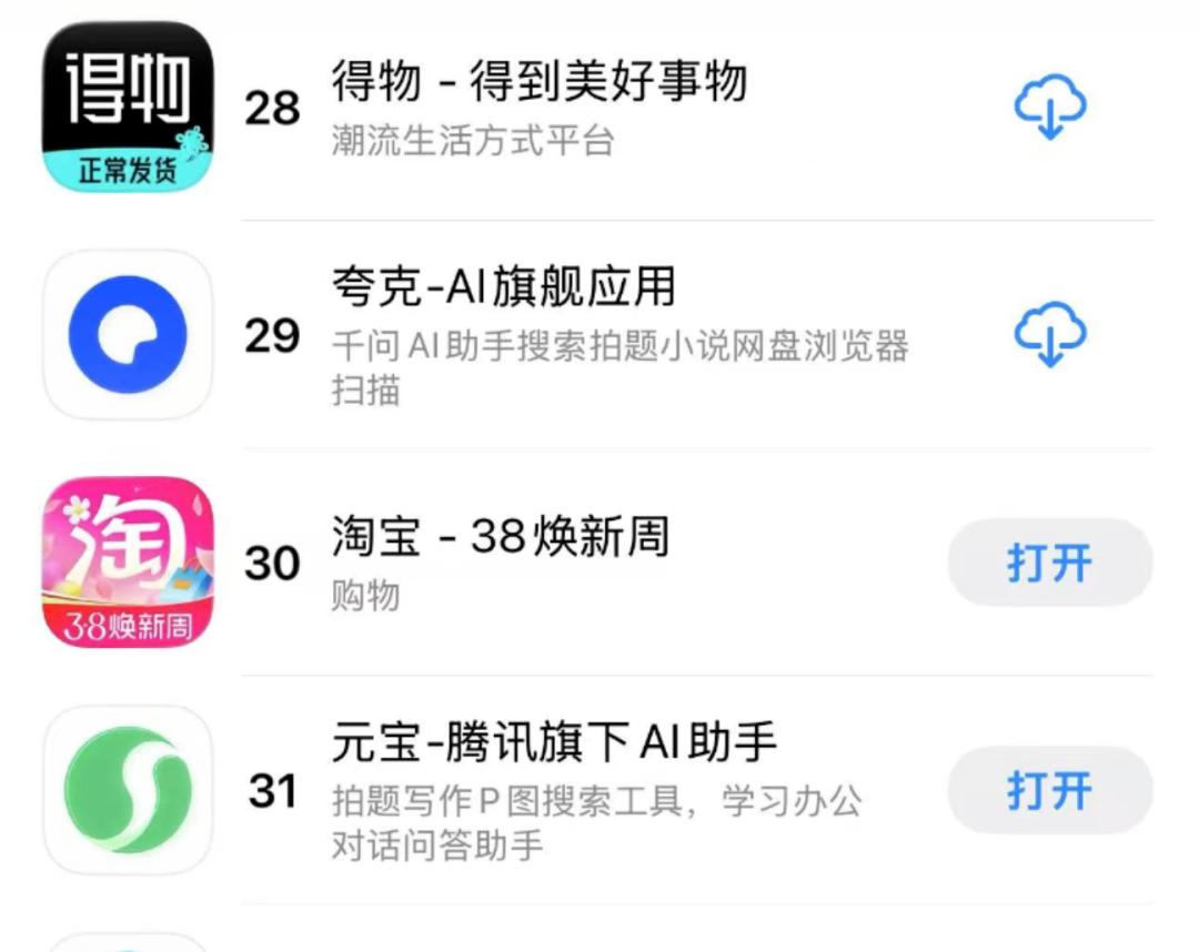 2月23日,App Store免费榜下载榜单显示,腾讯元宝已跌出前三十。同时,字节豆包、阿里千问和蚂蚁阿福仍然占据榜单前五。另一方面,元仍然没有解决基模能力不足的问题。