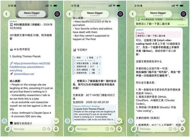 第二步,建立 RSS 抓取机制。我让 OpenClaw 帮我创建了一个抓取 RSS 内容的脚本,只保留文本内容并以 Markdown 格式储存,然后只保留最近两天的文章并自动清空历史文件。