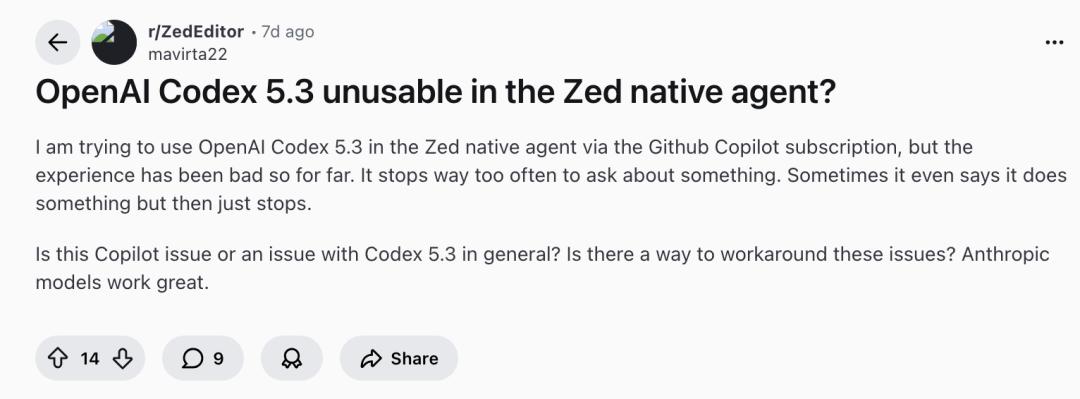 另一些用户反映新模型在某些编辑器里表现尚不成熟,例如在 Zed 编辑器中体验不佳,偶尔中断或无法按预期编辑文件,甚至有人因此重新回退使用老版本。