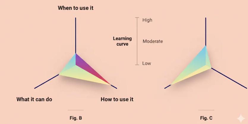 Google 设计库的框架是理解如何合理利用用户认知能力的绝佳指南。例如,如果需要学习大量新的 UI 操作(图 B),则应确保主要用例基于用户熟悉的事物。如果产品的行为特别动态(图 C),则应使用大量可识别的模式,以免用户感觉像是在摸索前进。