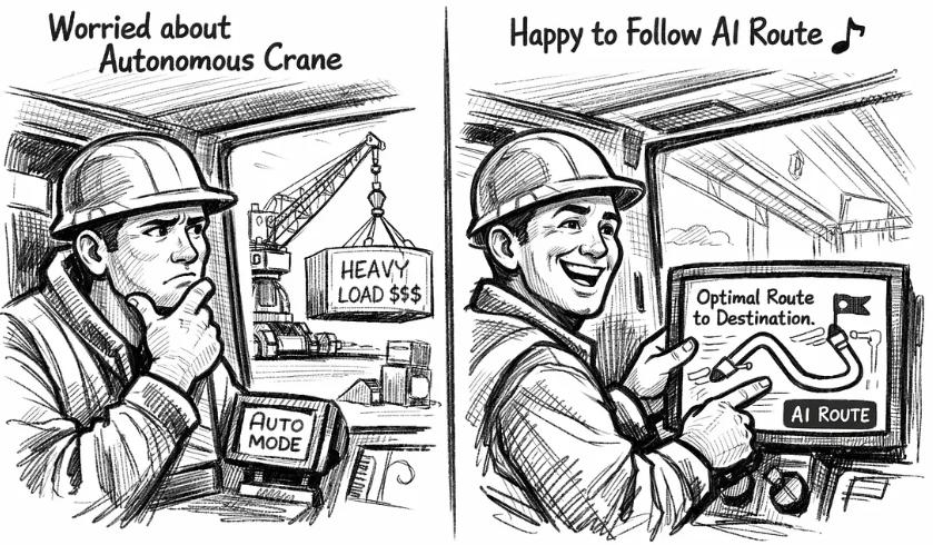 举个例子。假设你正在为一位起重机操作员设计系统,他最重要的任务是在搬运重物时确保货物和工作场所的安全。操作员对人工智能助手独立搬运重型昂贵货物的信任度,远低于他对人工智能推荐的最短路线的信任度。这表明,在开发自动驾驶功能之前,应该先着手开发路线推荐功能。