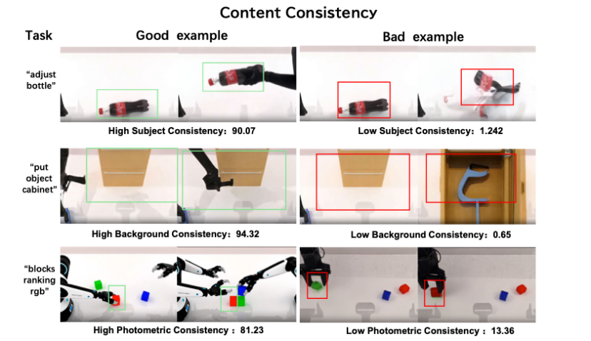 高分案例(90.07):在「adjust bottle」任务中,瓶子在机械臂交互全过程中保持形状、颜色、标识及位置的时序稳定,无漂移或形变,体现高保真「数字孪生」特性;
