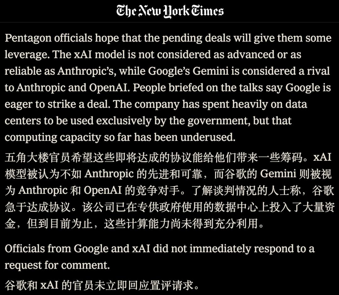 谷歌为了专门服务政府已经投入巨资建设数据中心,其 Gemini 模型被视为极具潜力的替代品。