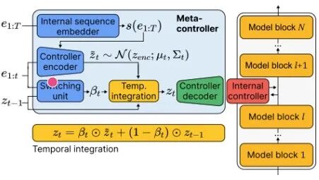 觉醒阶段则是元控制器及其驱动的内部强化学习。它学习如何操控基础模型(世界模型)的内部残差流激活,从而生成有意义的、持续多个时间步的抽象动作(如「前往蓝色位置」)。