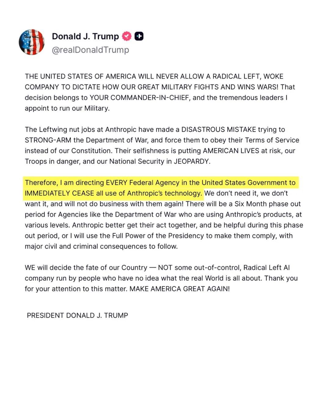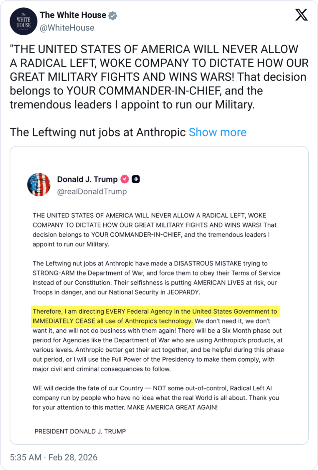 白宫官方账号于北京时间 2 月 28 日凌晨转发特朗普声明(发布于特朗普自己的媒体 Truth Social),宣布所有联邦机构立即停用 Anthropic 技术,给予六个月过渡期