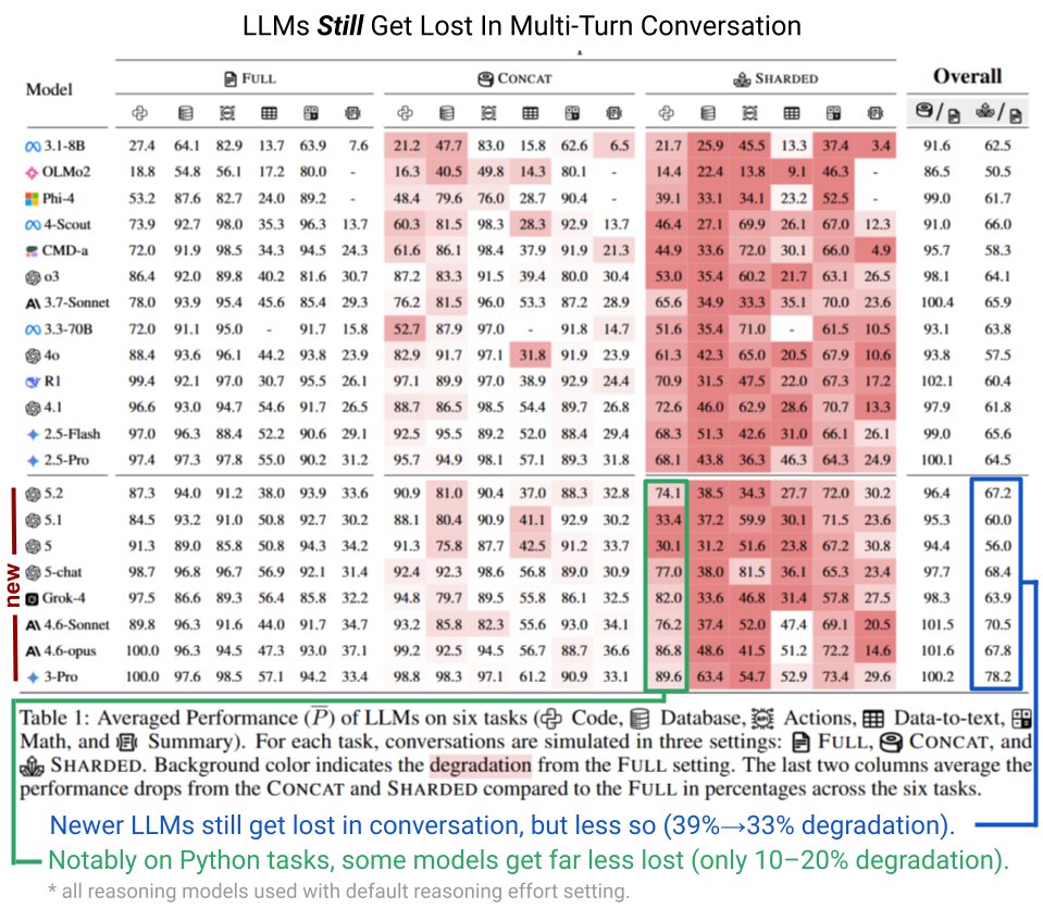 IT之家注意到,更新的模型表现略好一些,性能降幅从 39% 缩小到 33%,但问题远未解决。Python 任务的提升最为明显,部分模型仅损失 10%–20% 的性能。拉班认为,实际场景中的性能损失可能更严重,因为测试只使用了简单的用户模拟;如果用户在对话中途改变想法,性能下降幅度可能会更大。
