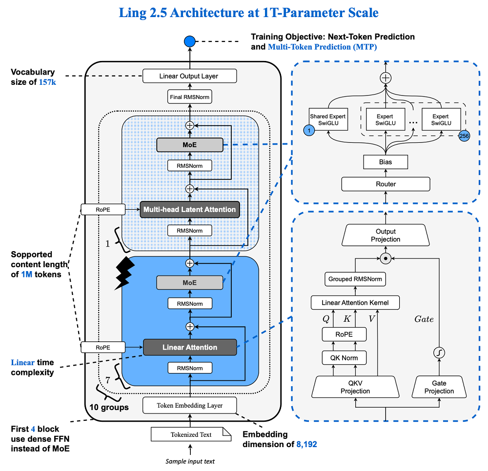 完成初步探索后,蚂蚁百灵团队在其基础上提出了Ling 2.5 架构:在Ling 2.0的基础之上,通过“增量训练”的方式,将原有GQA(改进版的注意力机制,仍然基于Softmax)升级为1:7的MLA + Lightning Linear混合结构,把混合线性注意力架构真正推向万亿规模。