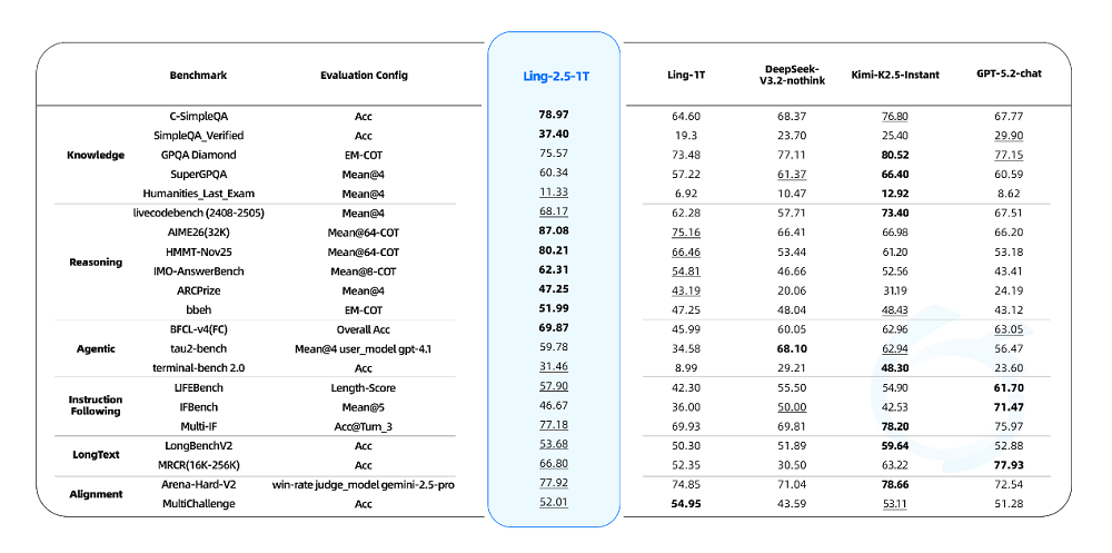 同时,效率的提升并未以性能为代价。在涉及推理、智能体、指令遵循、长上下文等场景的多项基准测试中,Ling-2.5-1T超越了DeepSeek-V3.2-nothink、Kimi-K2.5-Instant和GPT-5.2-chat等同类型的即时模型。