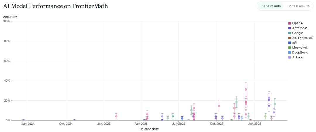 刚上线时最强AI连2%的题都做不出来,结果到了今天,GPT-5.2和Claude Opus 4.6已经能搞定基础题库40%以上的题目,连50道终极难度的第4级挑战题,正确率也突破了30%。