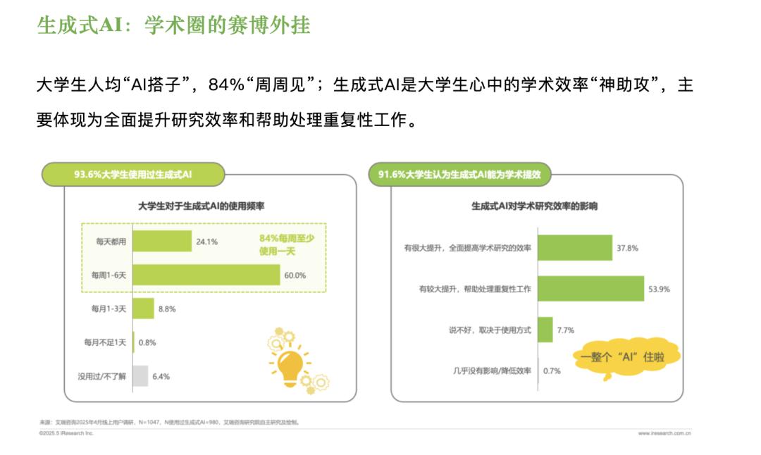 艾瑞咨询同年的调查则指向了一个更具体的场景:62.9% 的大学生在写论文遇到困难时会直接向 AI 提问,超过半数在写论文时使用生成式 AI。2025 年起,部分高校已对毕业论文实行重复率 +AIGC 重复率双查重制度。
