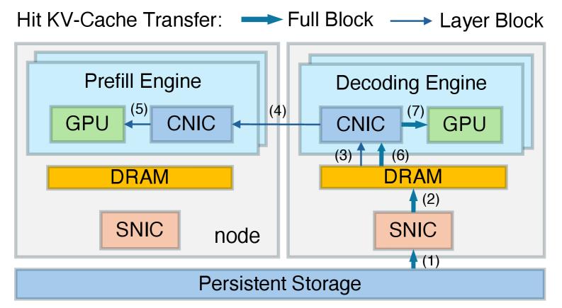 先前的架构采用的路径是:让预填充引擎直接通过自己的存储网卡,从硬盘或分布式存储中拉取KV-Cache数据。