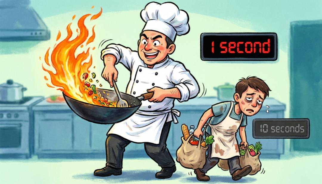 这就像一个顶级大厨,炒一盘菜只需要1秒钟,但他的助手买菜却要花10秒钟。