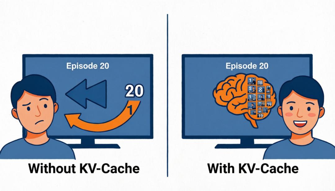 如果没有KV-Cache,就像你得了健忘症,每次看新一集,都得把前面19集从头到尾重看一遍,才能看懂第20集。