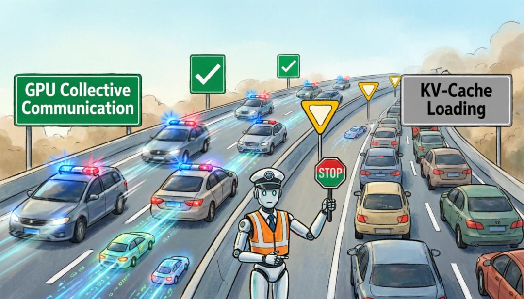 拉取KV-Cache数据的任务则只有普通优先级,VIP通道没车的时候它才能上路,只要GPU通信任务出现,它就得立刻避让。