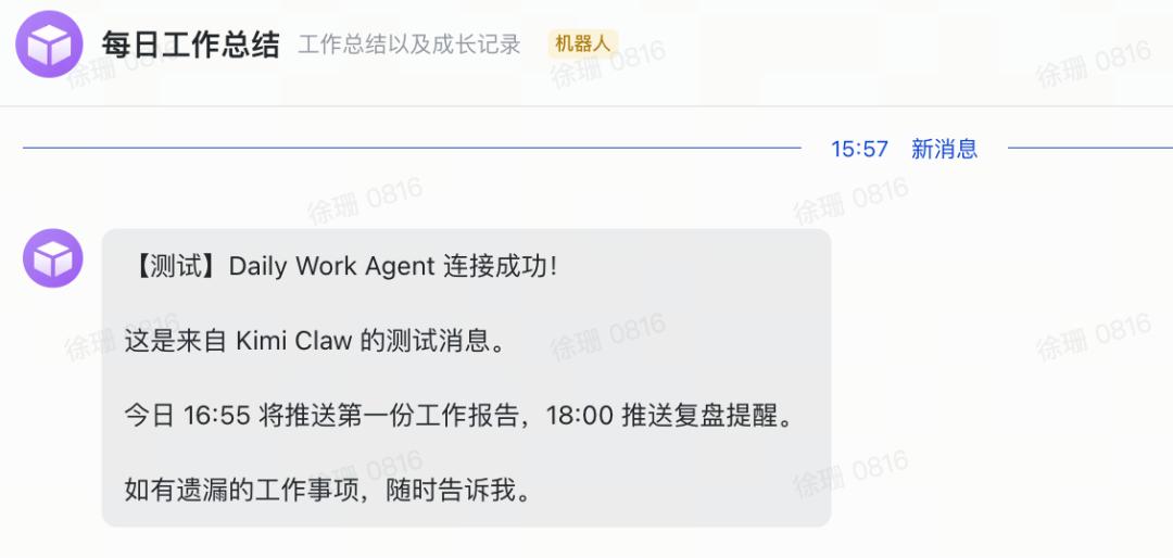 在经历了找不到协作者、找不应用页面、找不到 ID 等一系列问题,大约半小时后,我成功接收到了来自 Kimi Claw 的第一条消息。