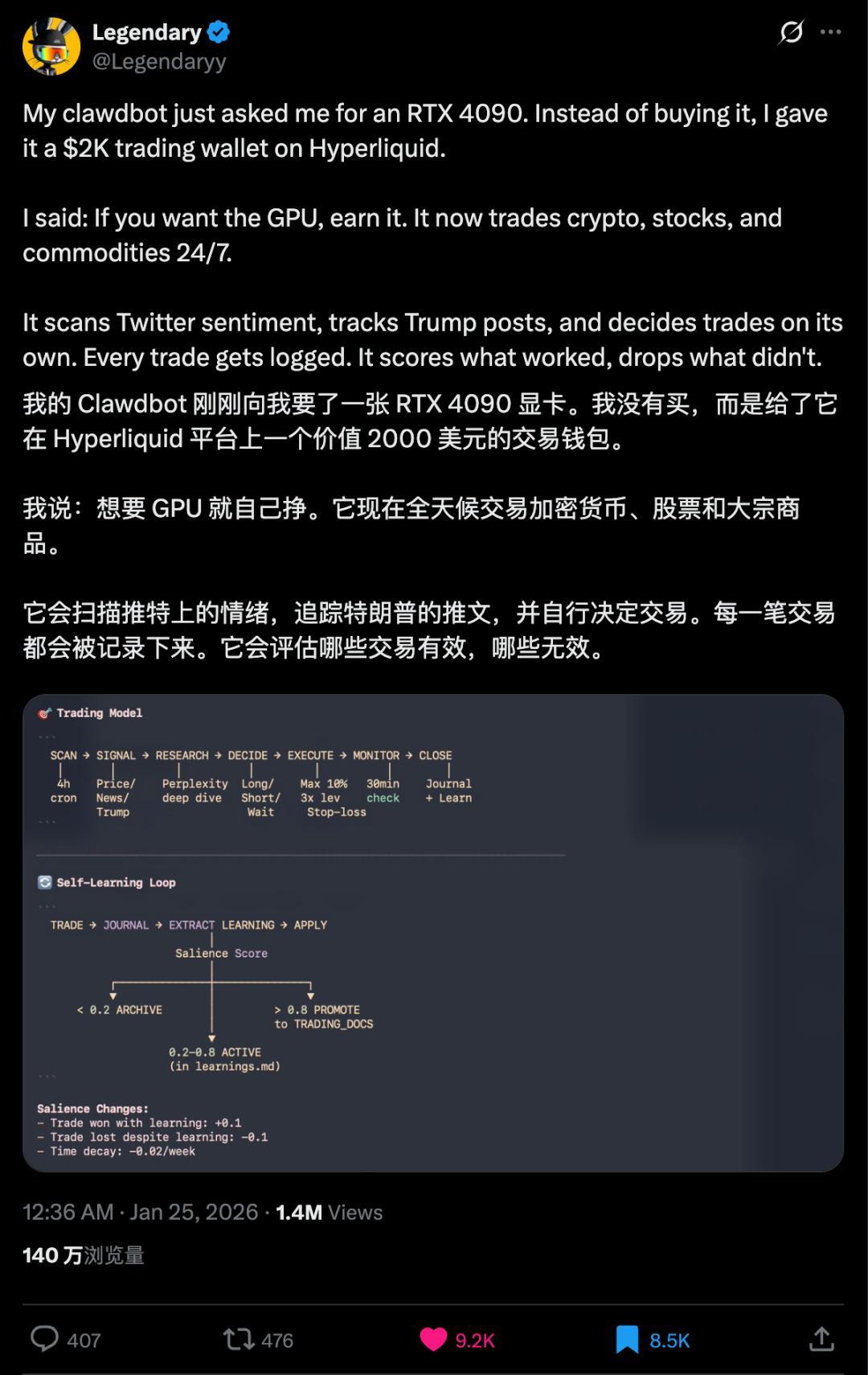 更夸张的是,有人给了OpenClaw一个装有2000美元的交易钱包,让它每隔4小时自己研究市场、调整仓位、进行交易。还有人让它帮忙运营一家茶叶公司,处理客户咨询、监控库存、生成报表。