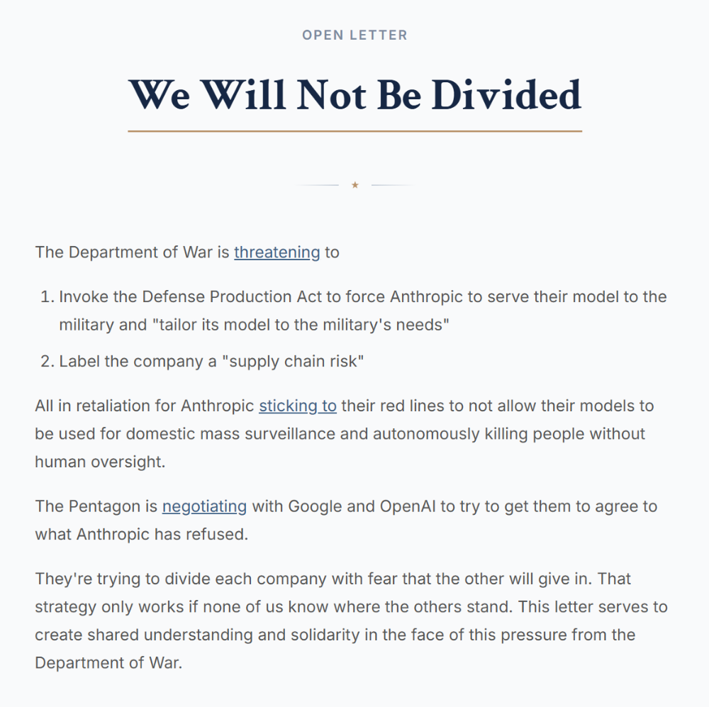 这一立场在行业内部引发了尖锐的批评。800多名谷歌和OpenAI员工联署了一封以“我们不应被分裂”(We Will Not Be Divided)为题的公开信,批评公司管理层的决定。