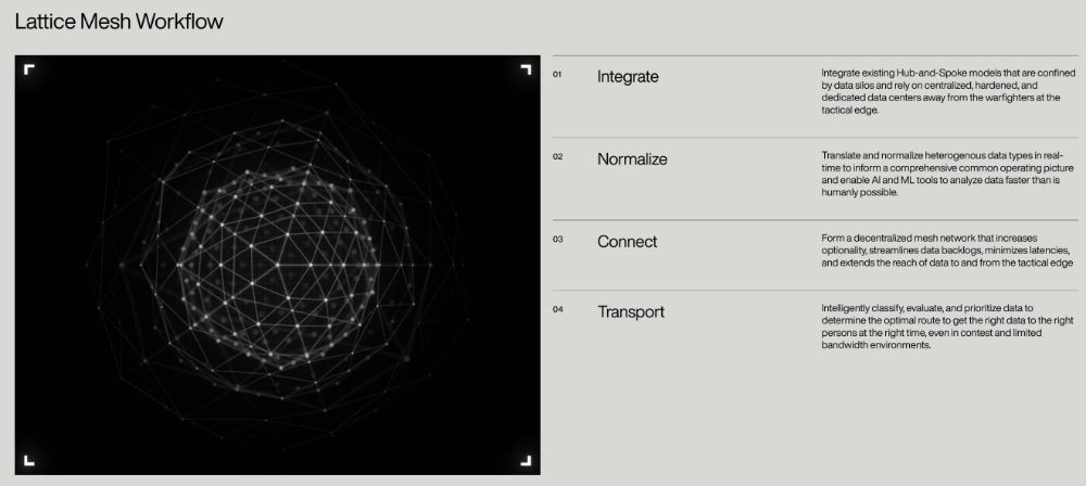 在认知层面,这些传感器采集到的海量原始数据,随后通过Anduril公司的Lattice Mesh战场感知网络进行实时汇聚与初步过滤。Lattice Mesh是一套分布式的机器学习平台,专为在高度对抗的电磁环境下维持战场态势感知而设计,即使部分节点被摧毁或干扰,系统仍能保持整体运转。