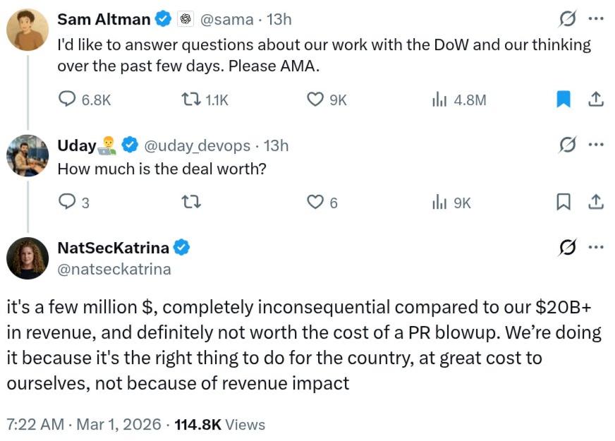 (OpenAI与美国国防部的交易金额)也就几百万美元,与我们200多亿美元的年收入相比微不足道,绝对不值得为此引发公关风波。