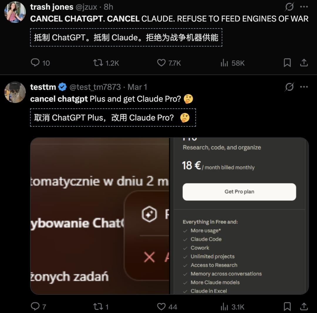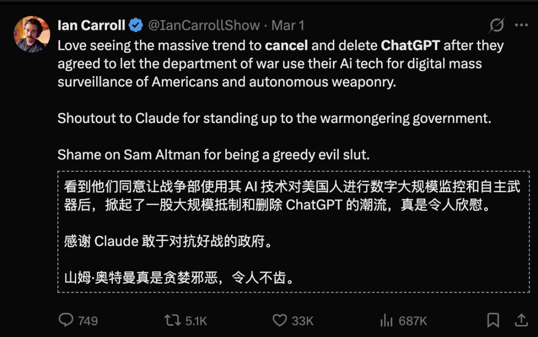 对比之下,OpenAI相当无耻,美国自发掀起卸载/取消ChatGPT运动,声势浩大,人声鼎沸!
