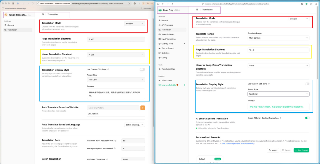 我们不妨从上往下看:在核心的翻译设置中,下拉菜单里从双语显示到只显示译文的选项逻辑与排列顺序,简直如出一辙。