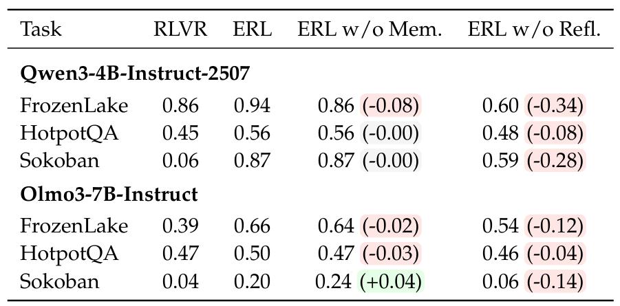 论文在三类经典任务上验证了ERL的效果,包括两个稀疏奖励环境Frozen Lake和Sokoban(推箱子),以及多跳问答任务HotpotQA