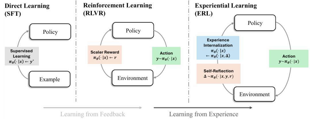 作者将当前大模型训练方式概括为一条逐步演进的路径:从监督微调依赖示例模仿,到强化学习依赖奖励信号进行优化,再到经验强化学习(ERL)强调从经验中学习。